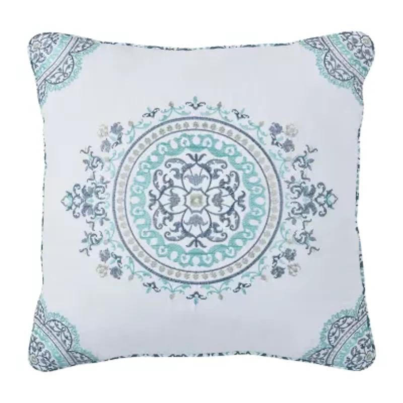 The Afton 16" Square Decorative Pillow features an intricately embroidered medallion design in various shades of blue, with engineered medallions in all 4 corners that are perfectly aligned. This classic mosaic look is adorned with a printed cord around all sides and reverses to a solid white pattern. Add the Afton Quilt or Comforter Set to add a fresh look to your decor.