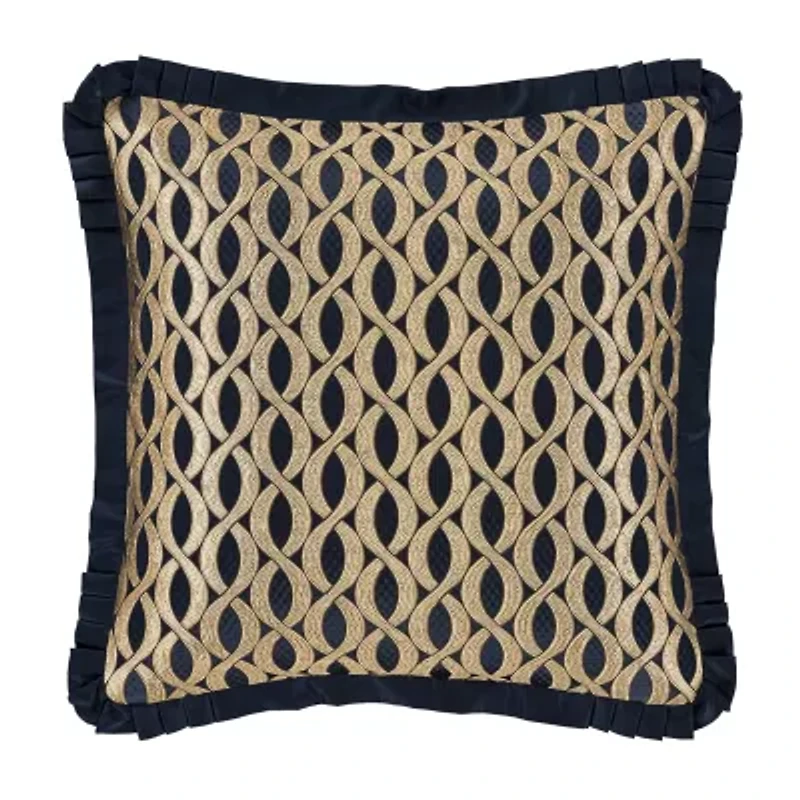 The Baylor euro sham features a bold interlocking woven damask design in glittering gold, woven into a dark navy textured matelass ground. Trimmed with a decorative flange that is pleated on all corners with a hidden zipper closure for a fine finish. This highly detailed euro sham is made to coordinate with the Baylor bed set for a complete look.