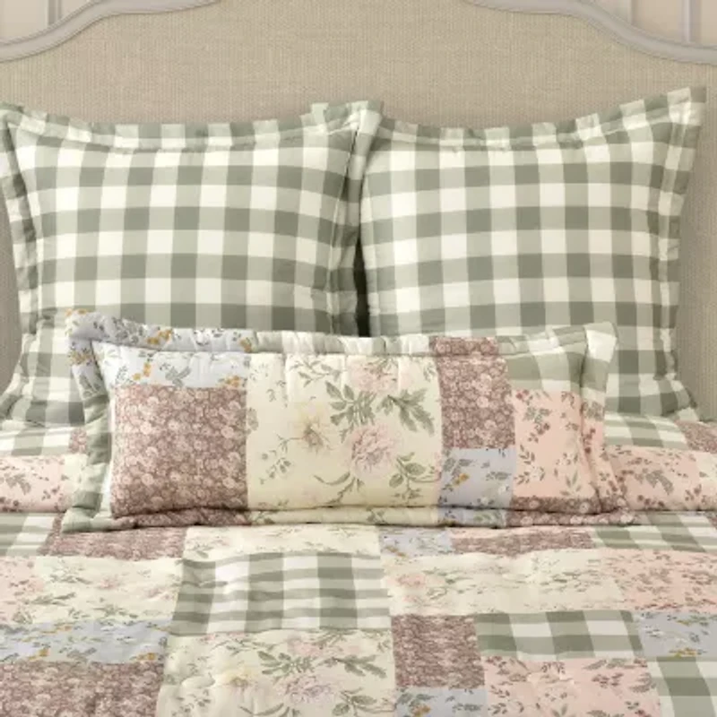 Inspired by the timeless beauty of vintage quilts, the Elmira Boudoir Throw Pillow showcases a stunning patchwork design in mixed-and-matched floral and gingham fabrics, bringing a sense of nostalgia and warmth. Dusty rose and various soft hues of blue, cream, and sage bring charming vintage cottage style to your bedroom. It reverses to a green gingham check and is trimmed with a padded 2 inch flange. Complete the look by adding the Elmira quilt and shams to the ensemble (each sold separately).