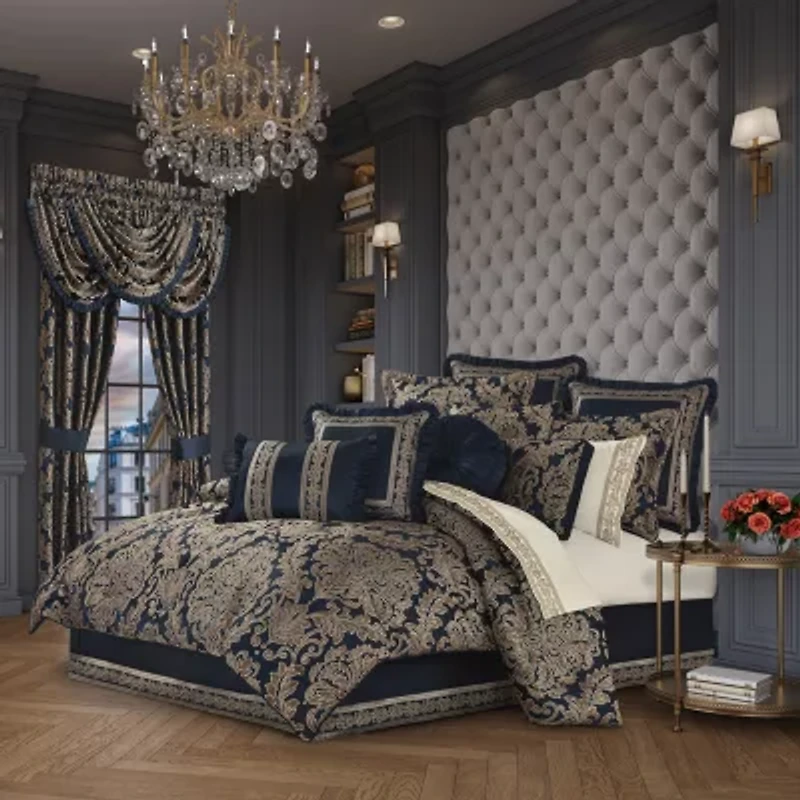 Grand-scaled European elegance is executed within every detail of the Modena 4-piece comforter set. A dramatic deep navy-blue satin matelass is paired with a classic damask pattern, which incorporates a unique weave technique giving the appearance of antique polished metals in bronze tones, outlined by golden yarns. A small satin piping finishes the lofty and oversized comforter that reverses to a plush solid fabric. Two padded pillow shams featuring a coordinate grand damask and a split-corner bed skirt with an elegant border along the bottom edge beautifully complete the set. Pair this bedding collection with the Modena throw pillows, euros, and window treatments to add luxury and opulence to your bedroom.