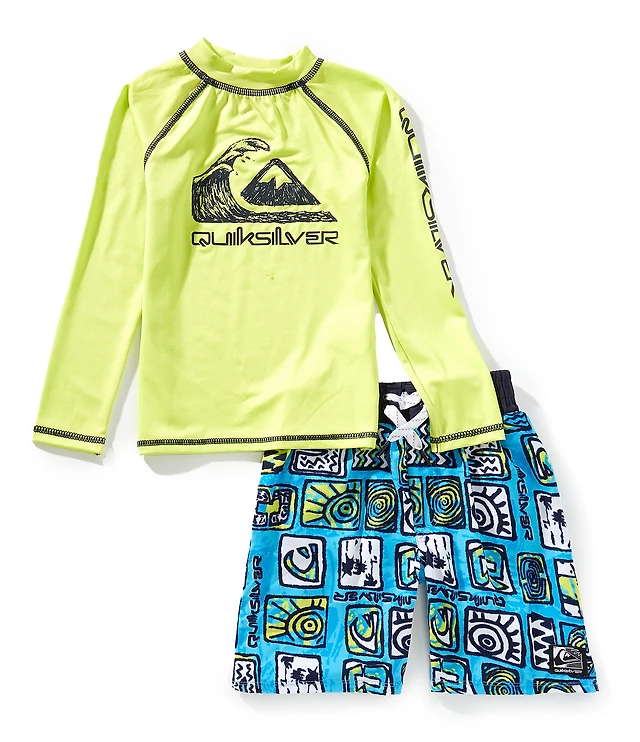 Quiksilver Little Boys Raglan-Sleeve Logo/Icon Rashguard T-Shirt & Mixed-Media-Printed Board Shorts Set