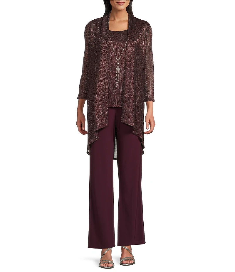 From R & M Richards Petite, this 2-piece pant set features: Top: crinkle metallic pleated fabrication scoop neckline 3/4 sleeves attached tank lined high-low hemline pullover construction approx. 38.5" jacket length tank and jacket: polyester/metallic; lining: polyester hand wash Pants: flat front silhouette mid rise elastic waistband lined straight hemline pull-on construction approx. 31" inseam polyester/spandex; lining: polyester hand wash Imported.