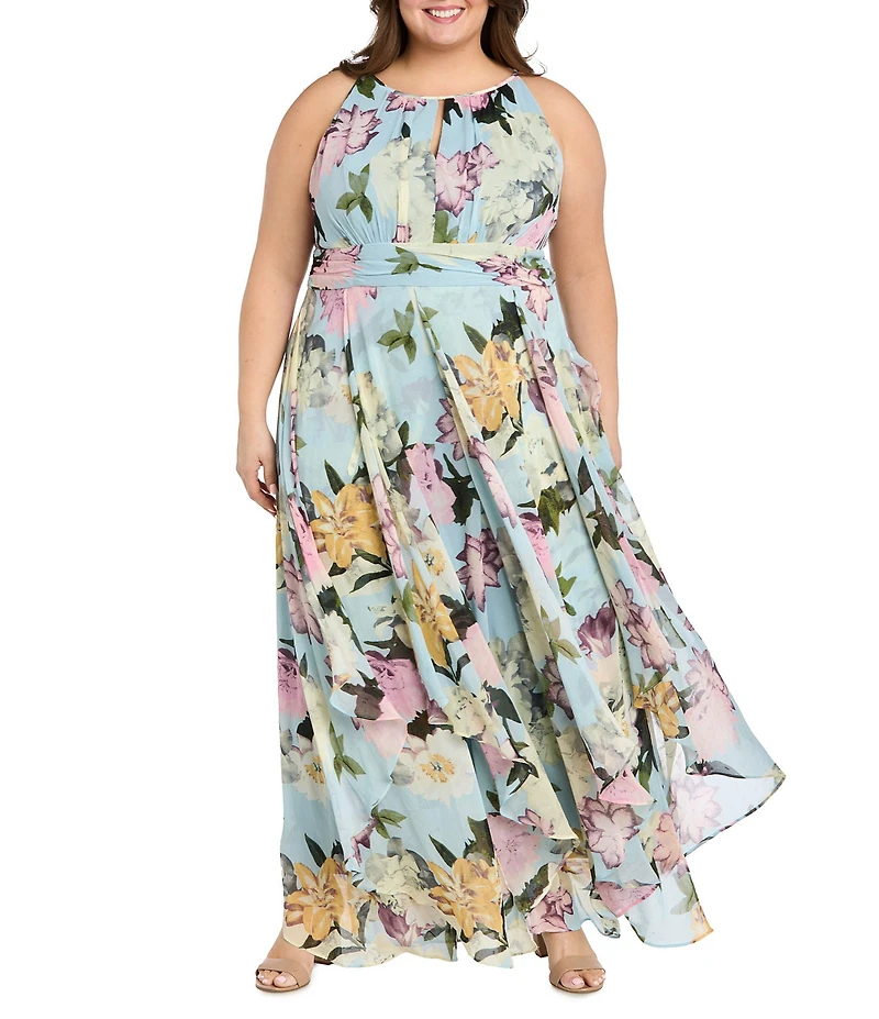 R & M Richards Plus Size Floral Print Keyhole Halter Neck Long Dress