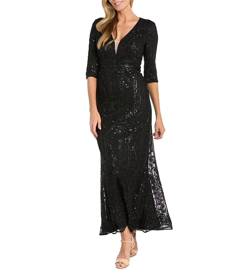 From R & M Richards, this dress features: Sequin power mesh fabrication V-neckline 3/4 sleeves Sheath silhouette Lined Zip back closure Approx. 59" in length Polyester/spandex Hand wash Imported.