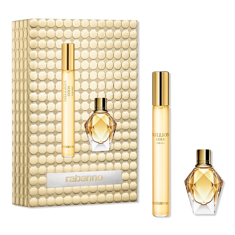 MGFH MG.34OZ+MGFH .17OZ. Get The Gift: Deluxe Miniature Million Gold for Her Eau de Parfum (0.17 oz, dabber). Travel Spray Million Gold for Her Eau de Parfum (0.34 oz). Key Notes: Top Note: Velvety Rose. Heart Note: White Flower Bouquet. Base Note: Mineral Musk. Features: An innovative duality opposing metallic rose oxide with feminine white flowers, contrasted with a salty mineral musk accord..