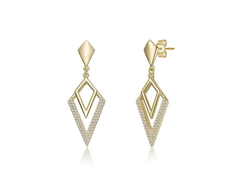Embrace the intersection of modern artistry and timeless luxury with these 14K Gold Plated Geometric Drop Earrings. Designed for the woman who carries herself with effortless grace, these earrings feature a captivating interplay of light and form. A polished kite-shaped stud leads the eye to a nested, open-frame drop, meticulously pave-set with clear round-cut cubic zirconia that shimmer with every movement. Whether you re adding a touch of brilliance to a power suit or a romantic glow to an evening gown, these drops provide a bold yet refined silhouette that transitions seamlessly from day-to-night. Lightweight and finished with secure post backs, they offer a sophisticated sparkle that feels as high-fashion as it does comfortable.• Pave-set Round-cut Cubic Zirconia• 14K Gold Plated finish• Versatile Day-to-Night Appeal• Rachel Glauber Radiant Confidence Signature