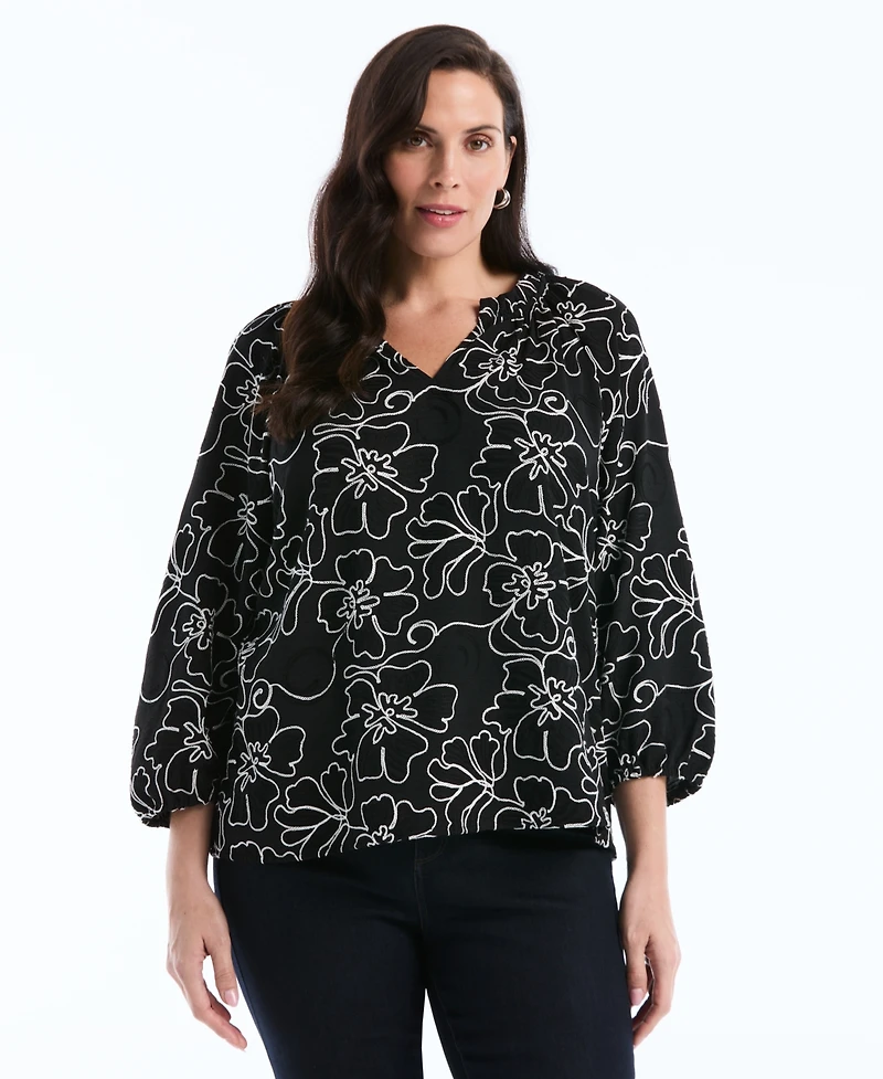 Rafaella Plus Floral Embroidered 3/4-Sleeve Blouse