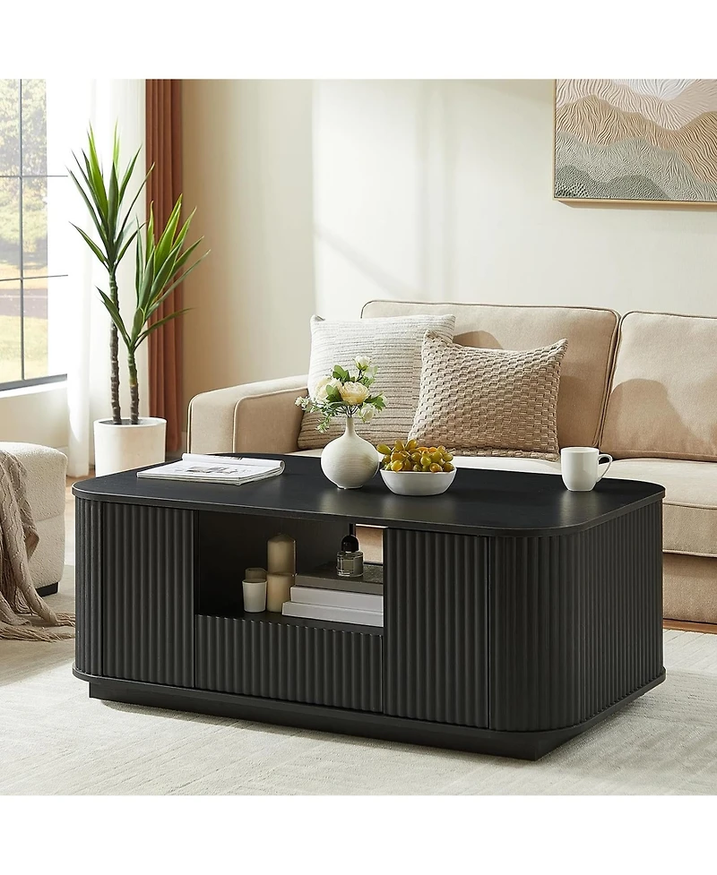 This 46.5 inch wooden coffee table features an elegant fluted design to elevate your living space with timeless charm. Built in an oval shape, it combines practical storage with sleek aesthetics, equipped with smooth pull out drawers, hidden storage cabinets and a spacious open shelf. It keeps daily essentials, books, remotes and small items neatly organized while maintaining a tidy surface. Crafted with sturdy solid construction, the table ensures stable support and long lasting durability for everyday use, serving as a functional and stylish center piece for any living room.