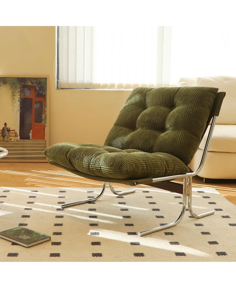 This Modern Accent Chair is a stylish upholstered reading chair with a polished chrome metal frame. Designed with soft padding and a streamlined silhouette, it delivers comfort and modern appeal for living room, home office, bedroom, and lounge areas.