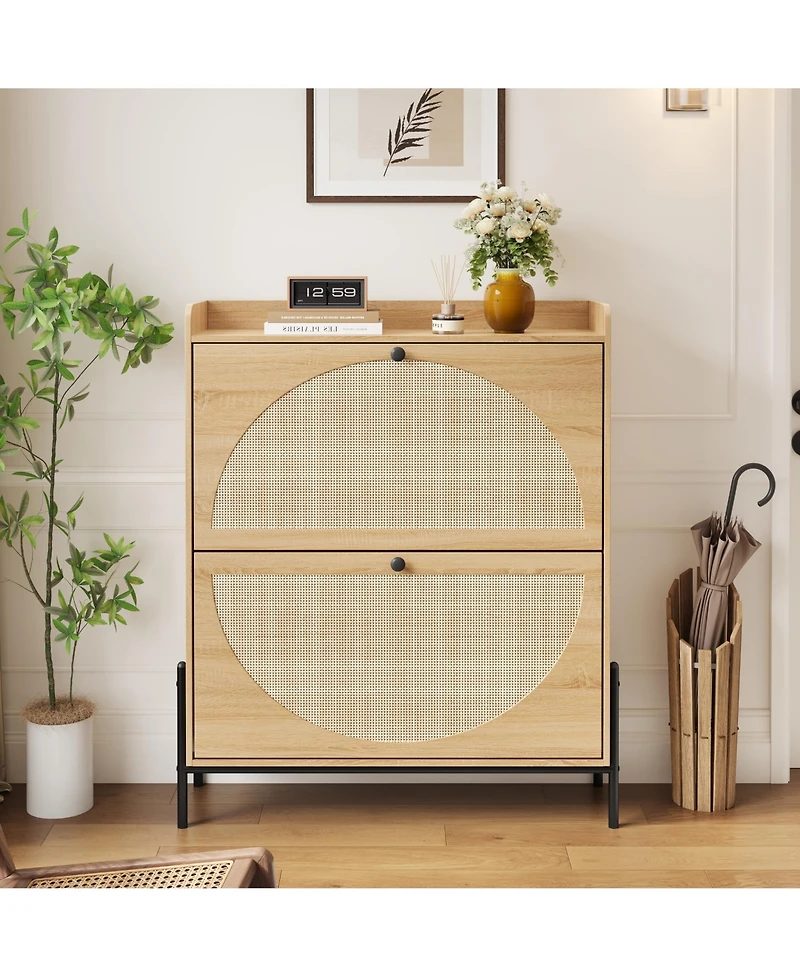 This rattan shoe cabinet brings natural charm and smart storage to your entryway. Featuring a slim freestanding frame, two flip-top drawers, and sturdy metal legs, it combines a stylish woven rattan appearance with practical organization. The compact design fits perfectly in narrow spaces while offering ample room for shoes of all sizes, keeping your hallway neat and dust-free. With a modern yet warm aesthetic, it works beautifully in entryways, hallways, and small living areas.