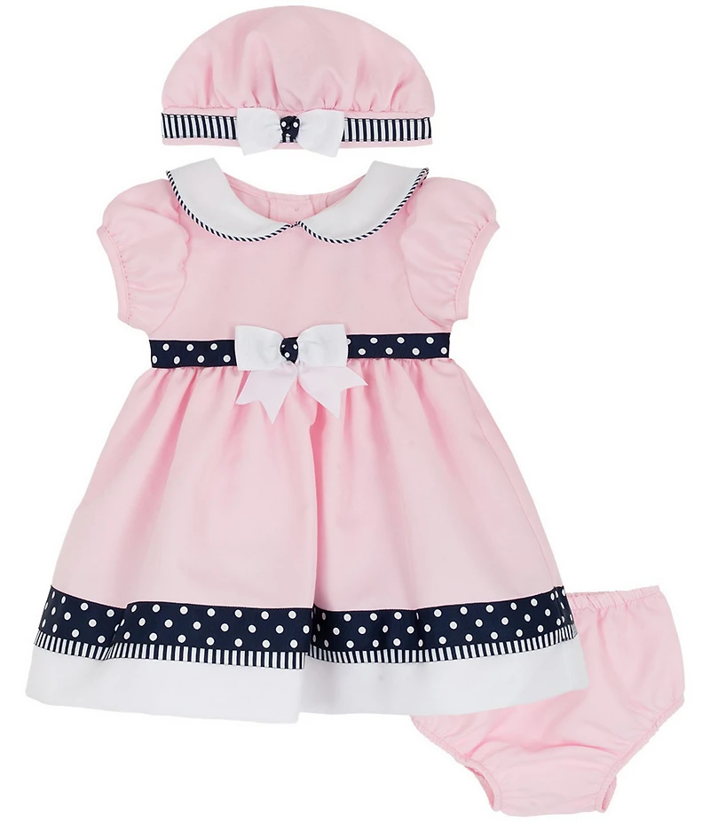 From Rare Editions, this dress features: Nautical-inspired design Timeless styling Peter Pan collar Short sleeves Contrast trim and bow detail Full, pleated skirt Button back Includes a matching hat with contrast trim and bow detail Includes matching panties Self of polyester; trim of polyester/cotton; white stripe of cotton Hand wash/line dry Imported.