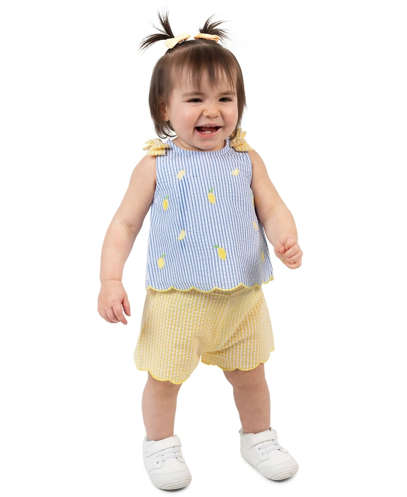 Sunny and sweet for warm-weather playdates, this Lemon Seersucker short set pairs a breezy blue-and-white striped seersucker tank sprinkled with tiny embroidered lemons and lemon wedges, finished with cheerful yellow gingham bow shoulders and a scalloped, lemon-yellow piped hem, with matching yellow gingham shorts featuring a comfy elastic waist and pretty scalloped edges for an instantly coordinated, picnic-ready look.