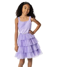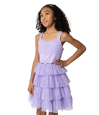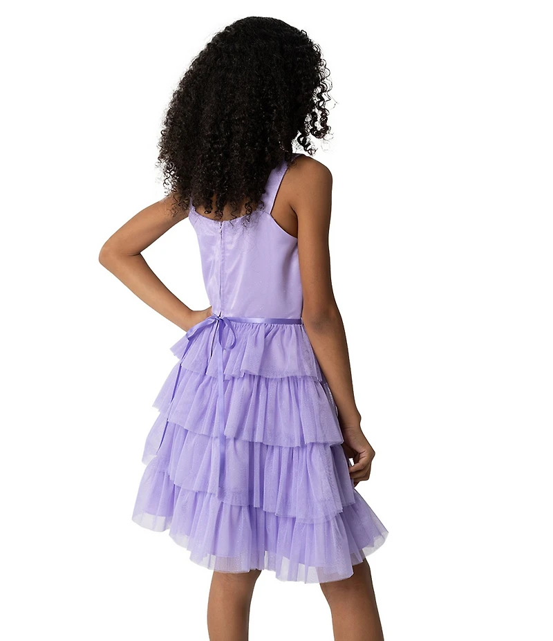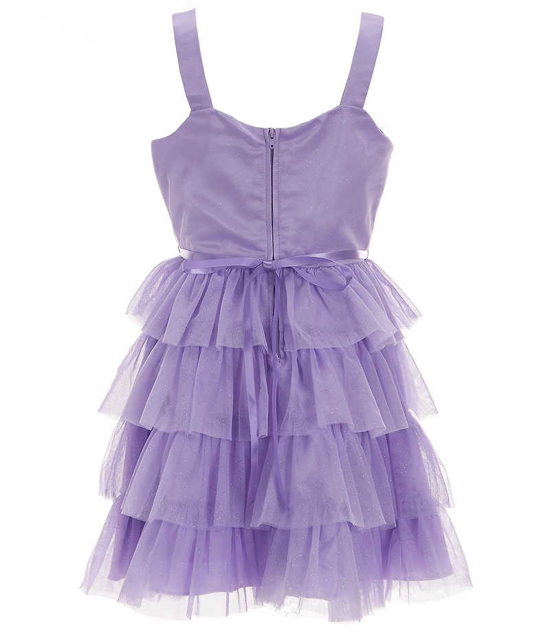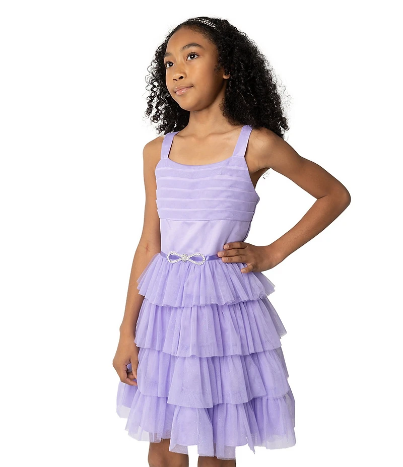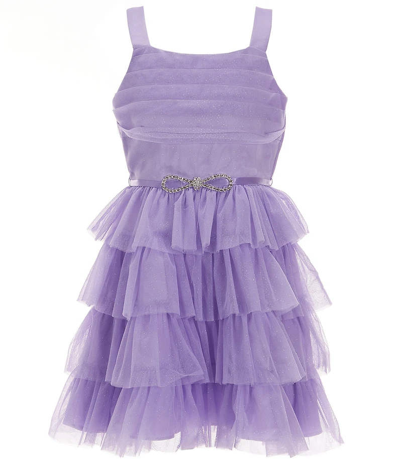 From Rare Editions, this dress features: Glitter-accented mesh design Square neckline Sleeveless styling Shoulder straps Fitted bodice Satin ribbon and jeweled bow trim at the waist Full, shirred ruffle-tier skirt Zippered back 29" length Polyester Hand wash/line dry Imported.