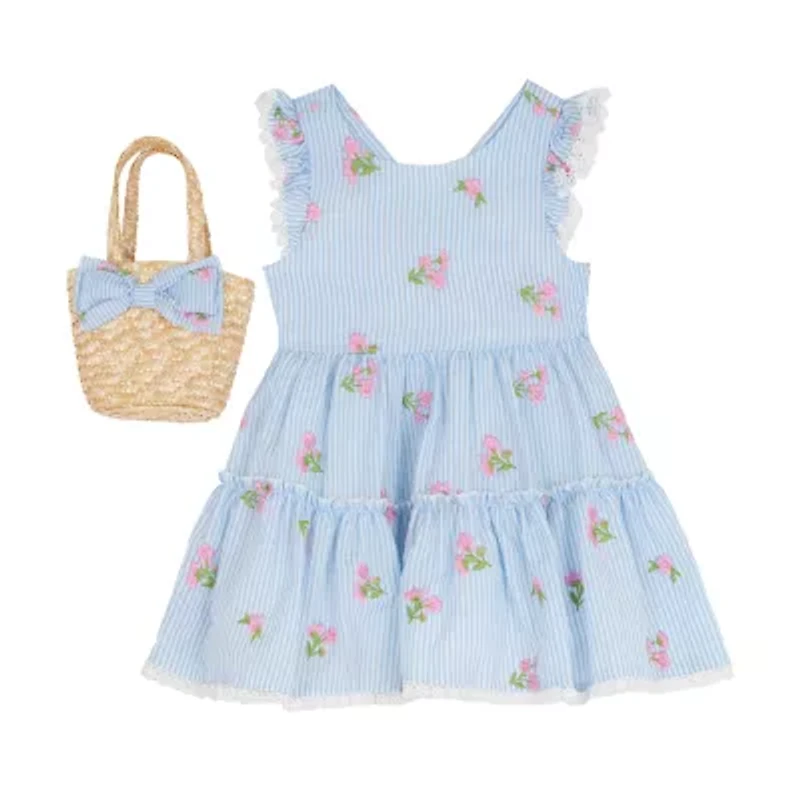 Accessorized with a sweet woven handbag, this adorable Rare Editions 2-piece set is perfect for warm-weather fun. Additionally, it features a seersucke dress with embroidered flowers, a round neckline, flutter sleeves with lace-trim, and an oversized back bow. Pair it with sandals or sneakers.