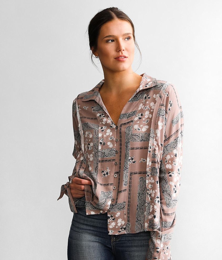 Woven button down blouse High low hem Tie cuff details Bust measures 47" on size small Body length 23 1/2" on size small Model Info: Height: 5'9" | Bust: 33 1/2" | Waist: 25 1/2" | Hip: 35 1/2" | Wearing Size: Small