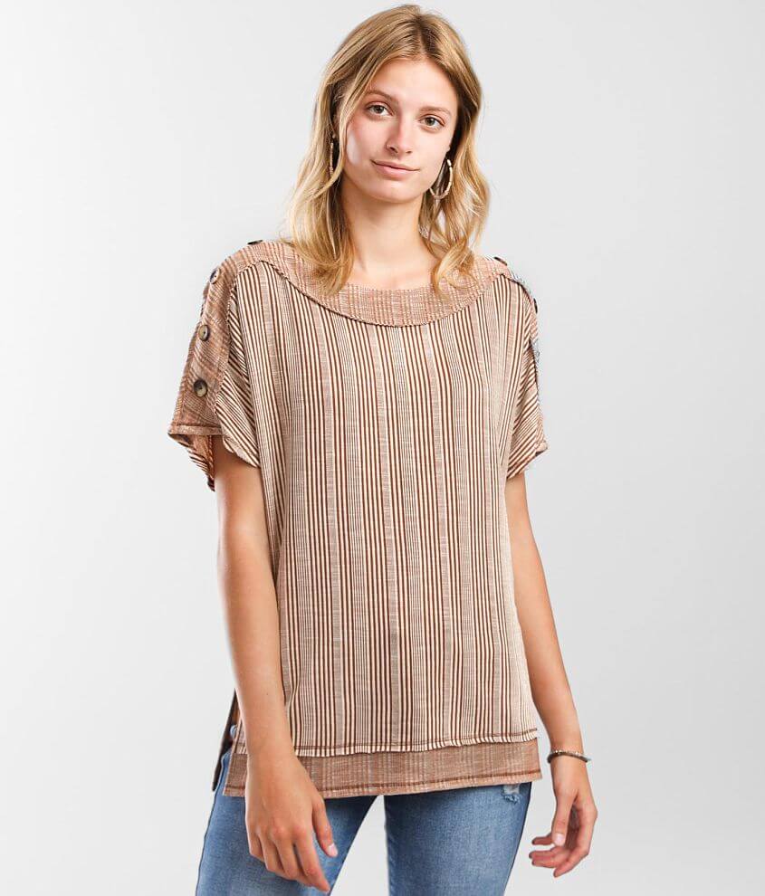 Slub knit reverse pieced top Faux button details Bust measures 40" on size small Body length 26 1/4" on size small Model Info: Height: 5'9" | Bust: 32" | Waist: 25" | Hip: 36" | Wearing Size: Small