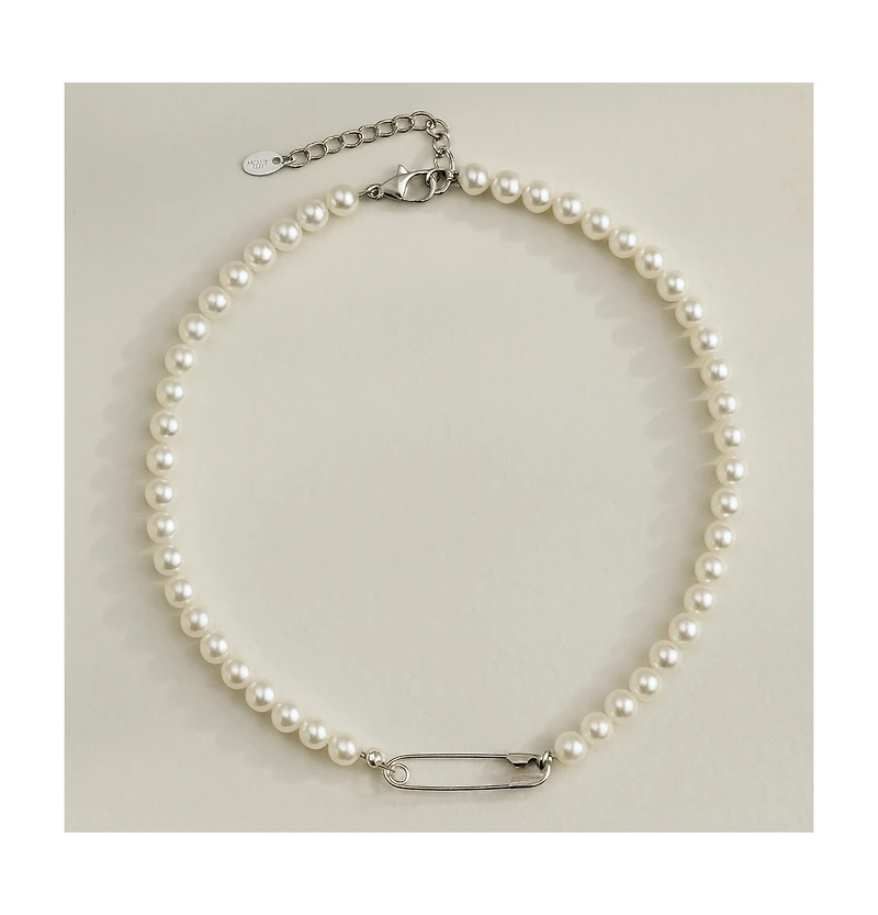 Classic elegance meets modern edge in this statement pearl necklace. Strung with luminous 8 mm round artisan glass pearls, this piece features a bold stainless steel safety pin clasp for a rebellious twist on timeless style. The necklace measures 18 inches with a 2 inch extender chain for an adjustable total length of 20 inches, offering versatility for layering or solo wear. Perfect for those who love blending refined and street-style aesthetics-pair it with denim, suiting, or evening looks for instant impact.