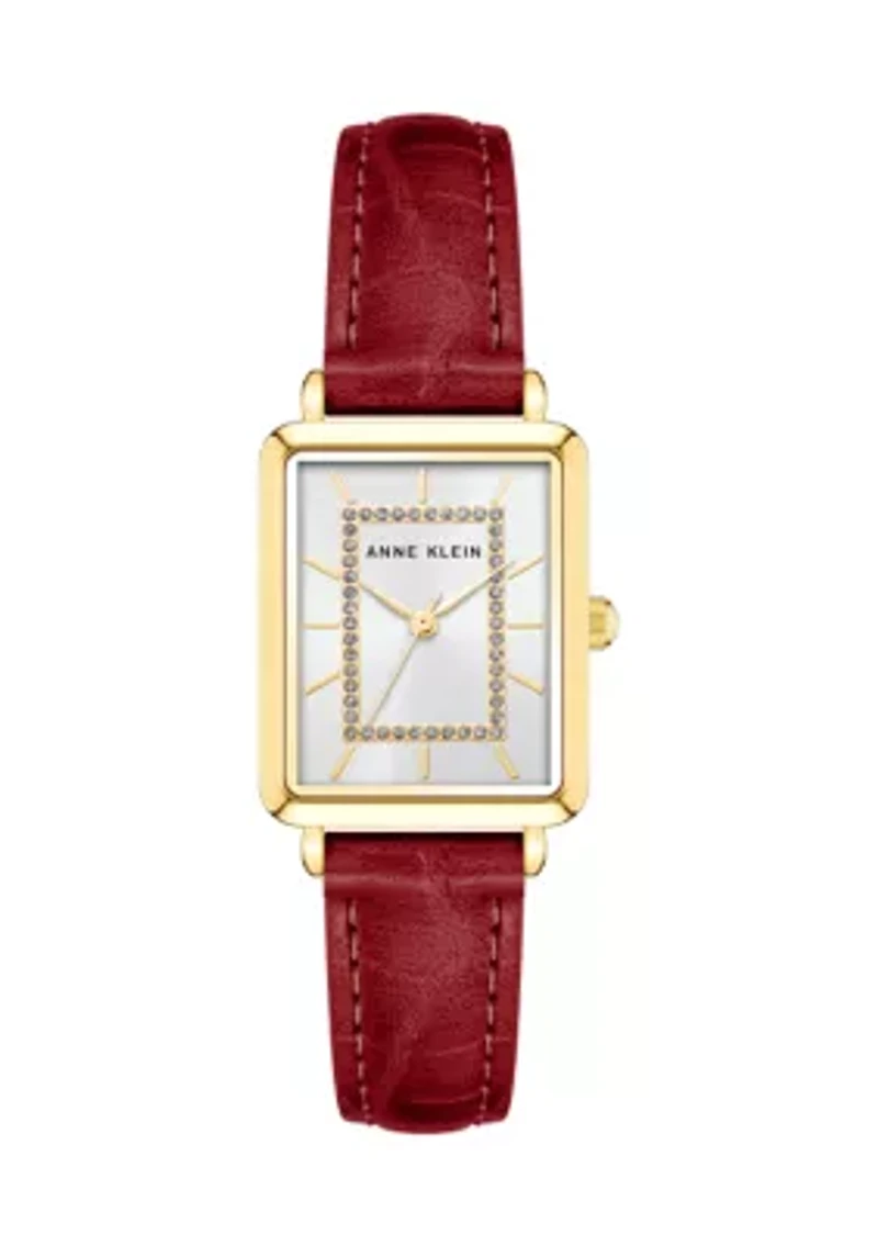 Red leather adds a pop of color to your jewelry collection, and this Anne Klein watch has beautiful glitter accents on the dial. 46 crystals Buckle closure Analog dial Japanese quartz movement Polished finish Bezel setting 11-year limited liability warranty available Imported Product Specifications 216 mm x 14.5 mm x 8 mm 34 mm x 36 mm case size Material & Care Leather, stainless steel Clean with a soft cloth