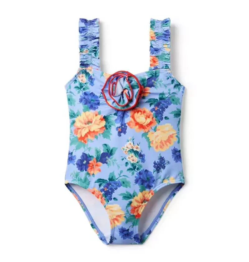 Sunny florals and a rosette detail make our swimsuit bloom. With ruffles, a sweetheart neckline and crossback straps. Plus, UPF 50+ protection to help keep them stylishly safe. Responsibly made with recycled fabric. 85% Recycled Polyester/15% Spandex; Lining: 100% Polyester Fully Lined UPF 50+ Sun Protection Chlorine Resistant Hand Wash; Imported
