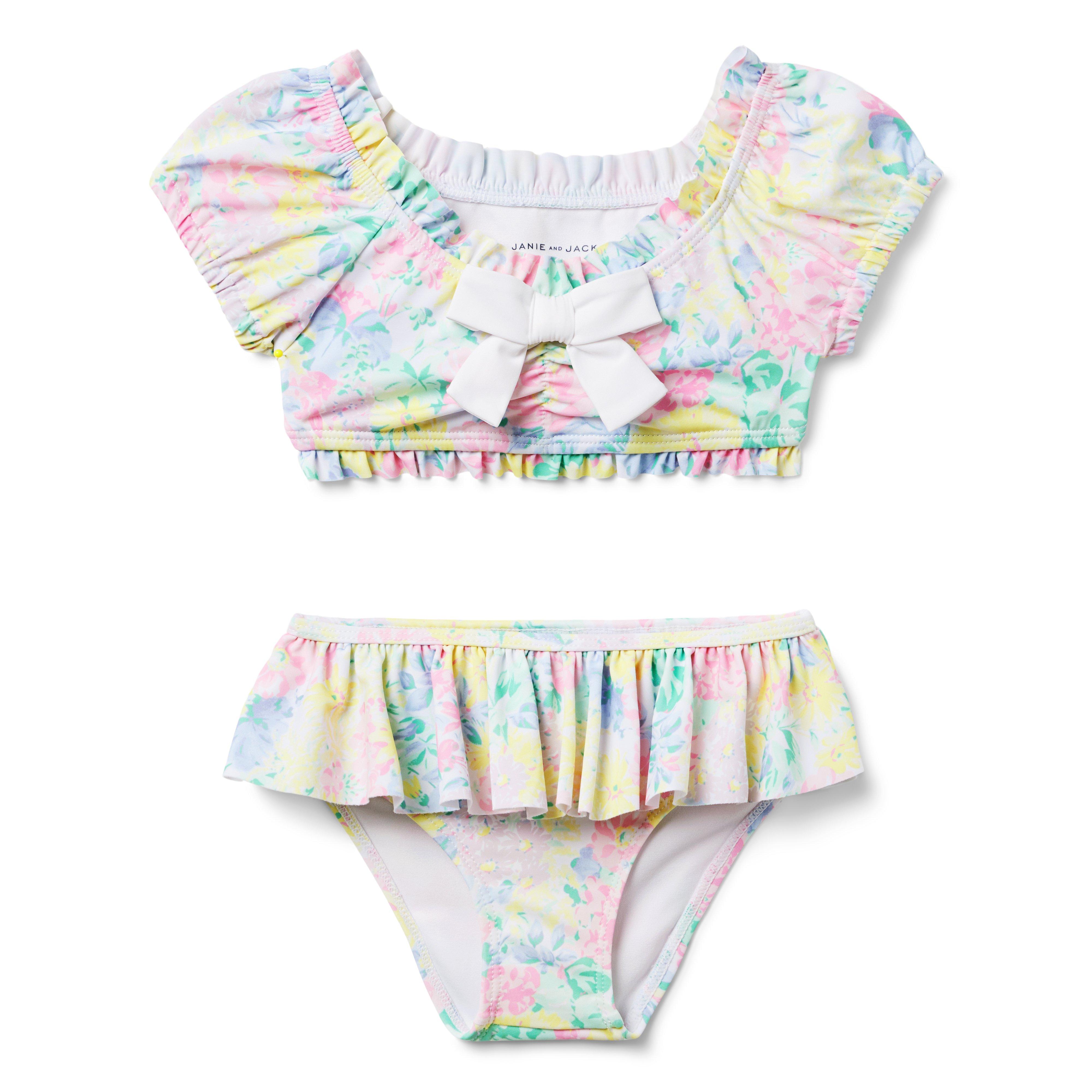 Make a splash in this floral swimsuit with ruffle details and a bow front. Plus, UPF 50+ sun protection to help keep them stylishly safe. Responsibly made with recycled polyester fabric. 85% Recycled Polyester/15% Spandex; Lining: 100% Polyester Fully Lined UPF 50+ Sun Protection Chlorine Resistant Matching Family Styles Available Hand Wash; Imported