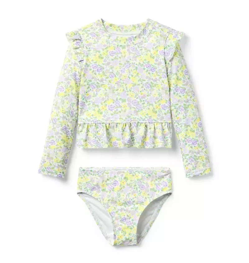 Make a splash with allover florals and ruffles too. Our rash guard swimsuit features a peplum hem and UPF 50+ sun protection to keep them stylishly safe. Responsibly made with recycled polyester fabric. Fully Lined UPF 50+ Sun Protection Chlorine Resistant Long Sleeve; Protective Swimwear 84% Recycled Polyester/16% Spandex; Lining: 100% Polyester Hand Wash; Imported