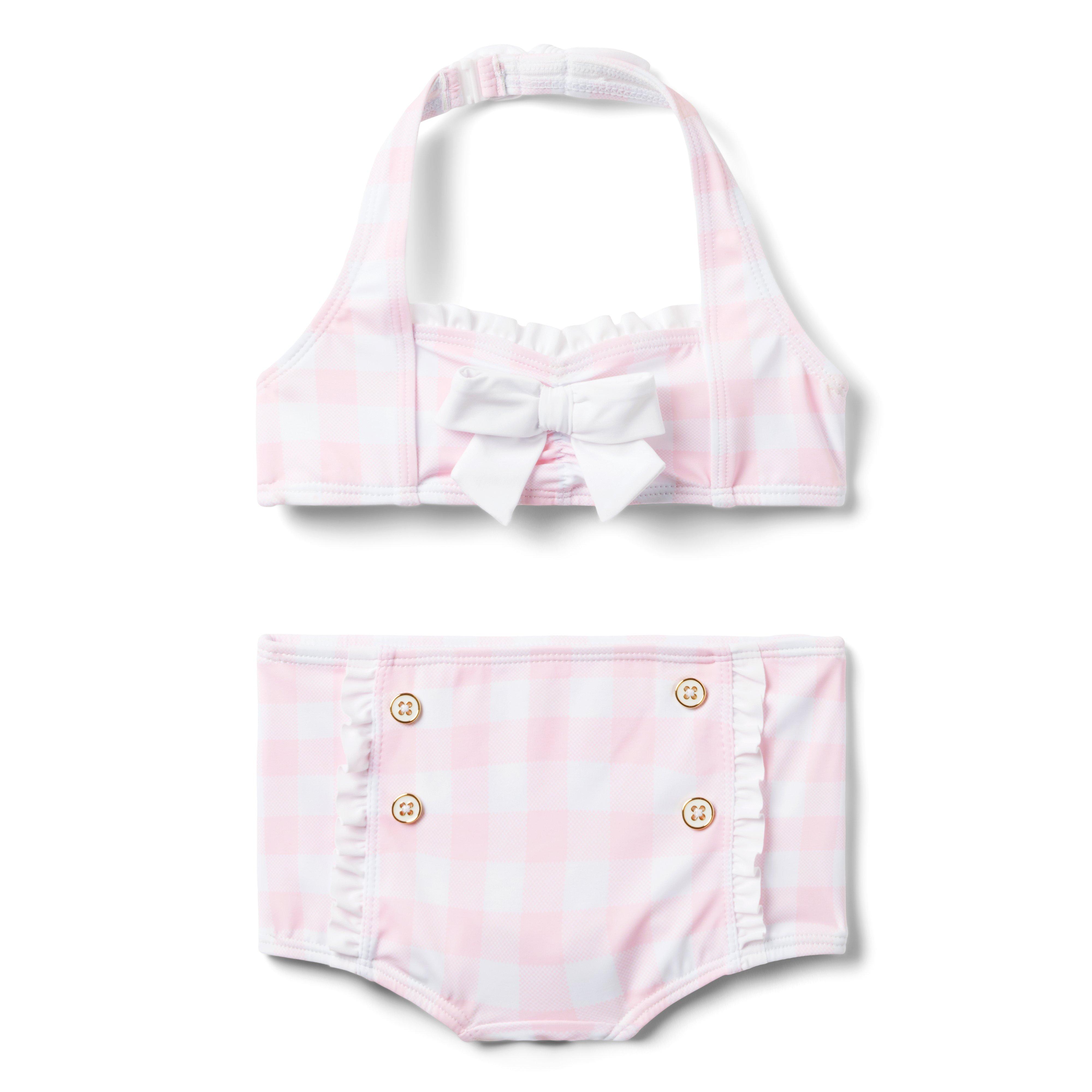 A retro swim look we love. Our gingham halter two-piece features ruffle trim, button details and a bow at the front. Plus, UPF 50+ sun protection to help keep them stylishly safe. Responsibly made with recycled polyester fabric. 85% Recycled Polyester/15% Spandex; Lining: 100% Recycled Polyester Fully Lined UPF 50+ Sun Protection Chlorine Resistant Snap At Halter Strap Hand Wash; Imported
