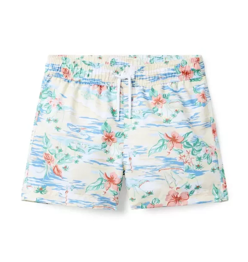 Swim days never looked so stylish. Our island floral swim trunk features UPF 50+ sun protection, a touch-close back pocket and an embroidered eyelet to let water drain out. 100% Polyester; Lining: 100% Polyester Fully Lined; Mesh Liner UPF 50+ Sun Protection; Chlorine Resistant Touch-Close Back Pocket; Inseam: 2 ¼" Elasticized Waist; Functional Drawstring Matching Family Styles Available Machine Washable; Imported