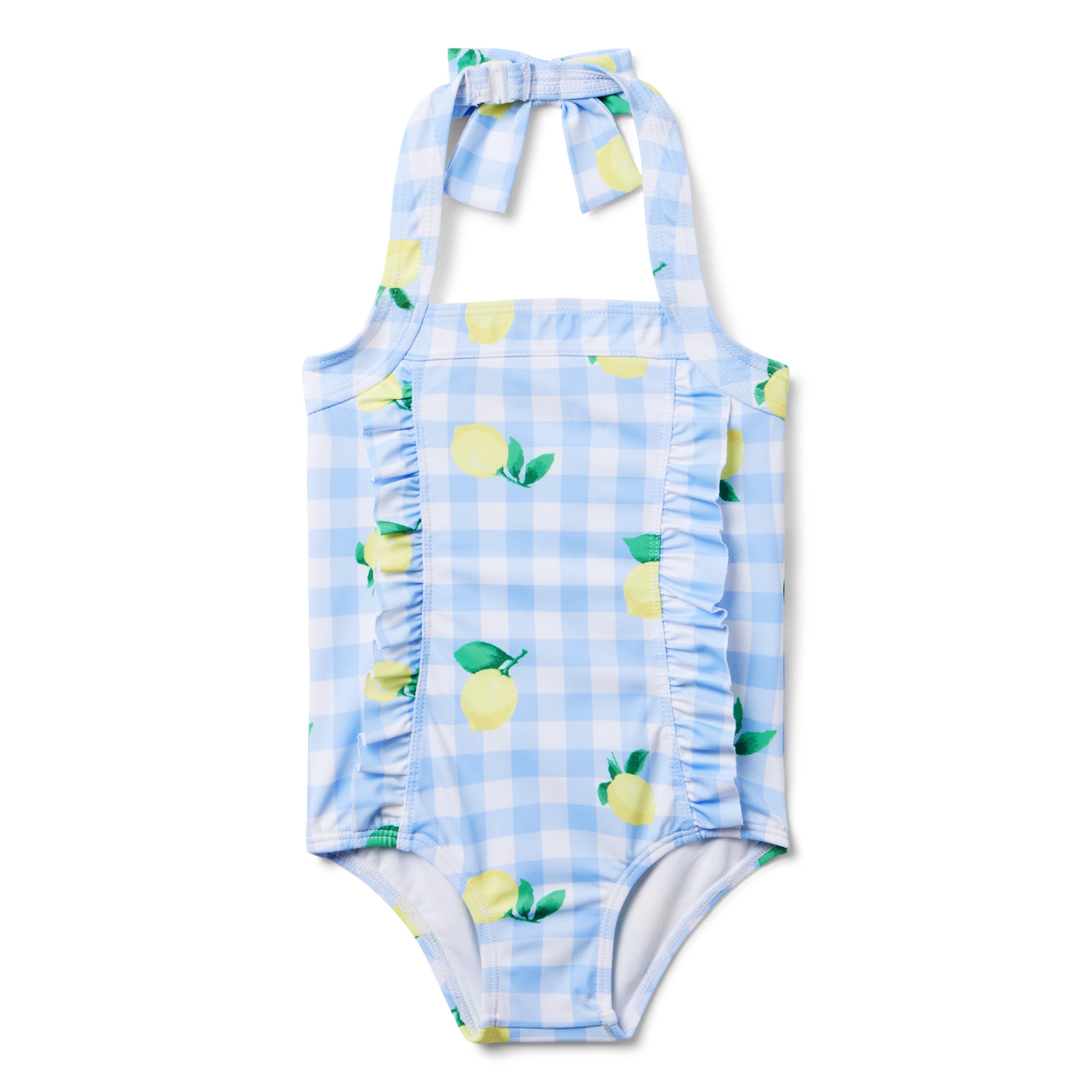 Our gingham swimsuit with a lemon twist. Featuring ruffle details and a halter silhouette. Plus, UPF 50+ sun protection to help keep them stylishly safe. Responsibly made with recycled polyester fabric. 85% Recycled Polyester/15% Spandex; Lining: 100% Recycled Polyester Fully Lined UPF 50+ Sun Protection Chlorine Resistant Snap At Halter Strap Matching Family Styles Available Hand Wash; Imported