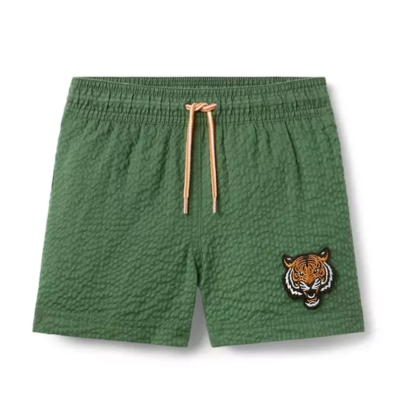 Make waves in seersucker. Our swim trunk features a tiger patch detail, UPF 50+ sun protection and a touch-close back pocket. Responsibly made with recycled fabric. 65% Recycled Polyester/35% Cotton; Lining: 100% Polyester Fully Lined; Mesh Liner UPF 50+ Sun Protection; Chlorine Resistant Touch-Close Back Pocket; Inseam: 2 ¼" Elasticized Waist; Functional Drawstring Online Exclusive Machine Washable; Imported