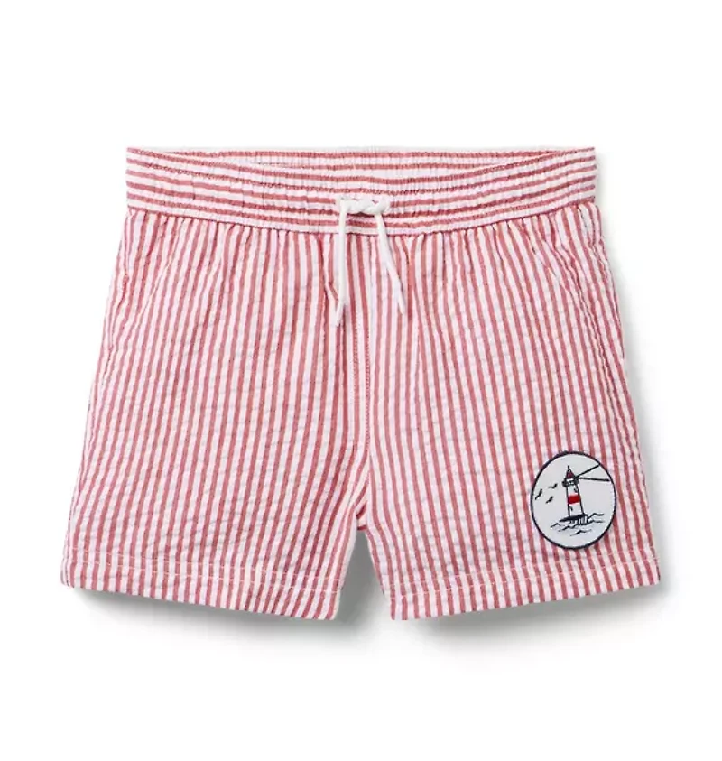 Nothing says sunny style like classic striped seersucker. Our swim trunk features UPF 50+ sun protection, a touch-close back pocket and embroidered eyelets to let water drain out. Responsibly made with recycled fabric. 65% Recycled Polyester/35% Cotton; Lining: 100% Polyester Fully Lined; Mesh Liner UPF 50+ Sun Protection; Chlorine Resistant Touch-Close Back Pocket; Inseam: 2 ¼" Elasticized Waist; Functional Drawstring Online Exclusive Machine Washable; Imported