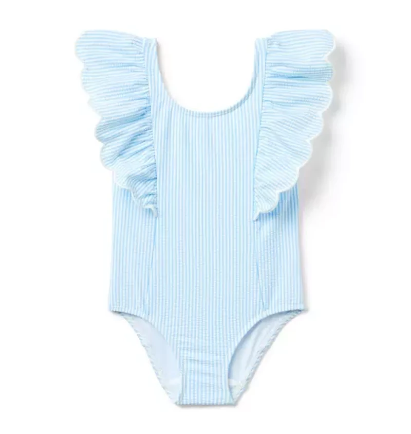 Catch a wave in retro-inspired striped seersucker. Our swimsuit features a ruffle detail, scalloped trim and scoop back. Responsibly made with recycled polyester fabric, with UPF 50+ sun protection to help keep them stylishly safe. 54% Recycled Polyester Seersucker/41% Nylon/5% Spandex; Lining: 100% Polyester Fully Lined UPF 50+ Sun Protection Chlorine Resistant Online Exclusive Hand Wash; Imported
