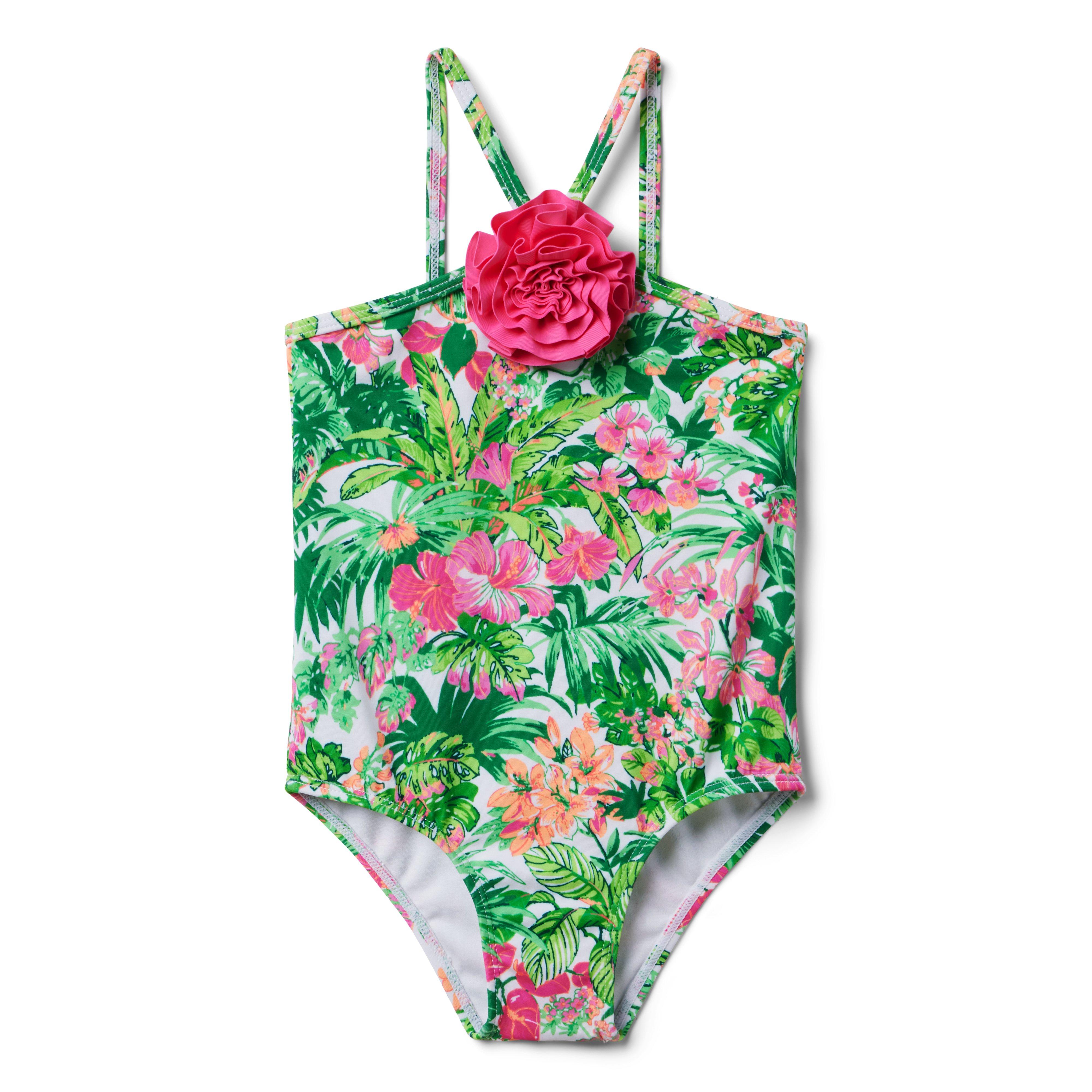 For sunny days and getaways, our tropical floral swimsuit with a halter neckline and 3D rosette. Plus, UPF 50+ sun protection to help keep them stylishly safe. Responsibly made with recycled polyester fabric. 85% Recycled Polyester/15% Spandex; Lining: 100% Polyester Fully Lined UPF 50+ Sun Protection Chlorine Resistant Matching Family Styles Available Hand Wash; Imported