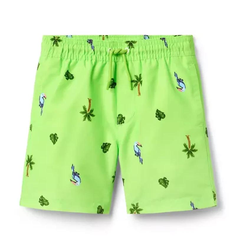 Island style wear-ever they go with our swim trunk featuring allover tropical icons. With UPF 50+ sun protection, a touch-close back pocket and embroidered eyelets to let water drain out. Responsibly made with recycled fabric. 100% Recycled Polyester; Lining: 100% Polyester Fully Lined; Mesh Liner UPF 50+ Sun Protection; Chlorine Resistant Touch-Close Back Pocket; Below The Knee Length Elasticized Waist; Functional Drawstring Machine Washable; Imported
