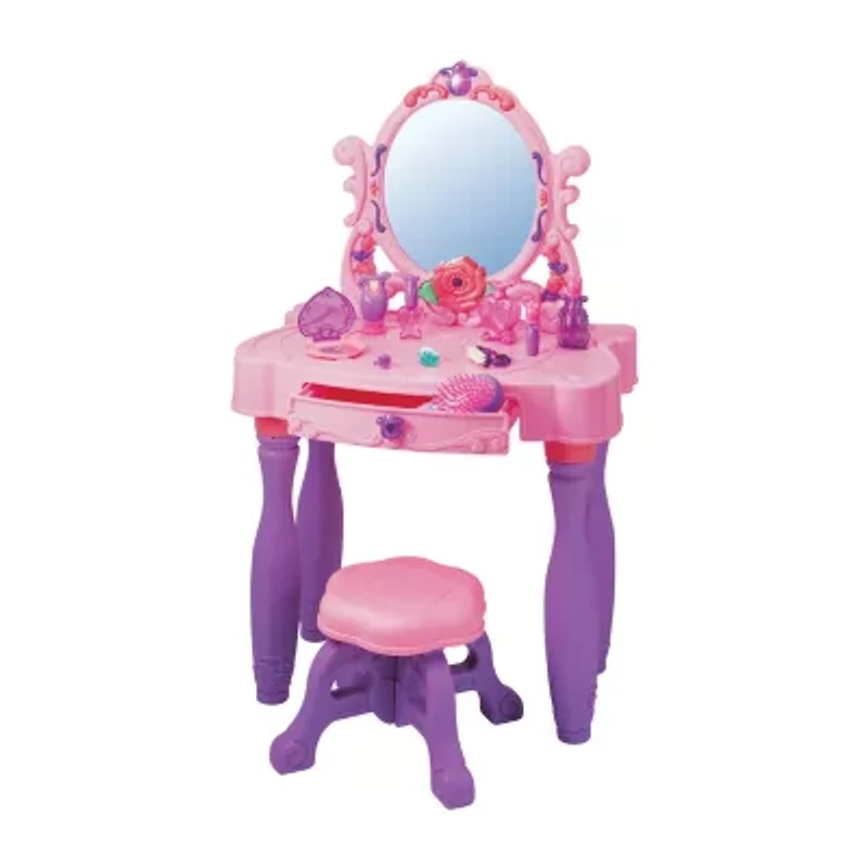 The light up princess vanity table is a perfect gift for beauty make believe! It includes a light-up mirror, vanity table, stool and many beauty accessories. A total of 12 pieces including: perfume bottle, play lipstick, nail polish, nail brush, lotion, eye shadow compact, hand cream, hair brush, hair clip and ring. Assembled size: L18. 5" x W 12. 5" x H 31".