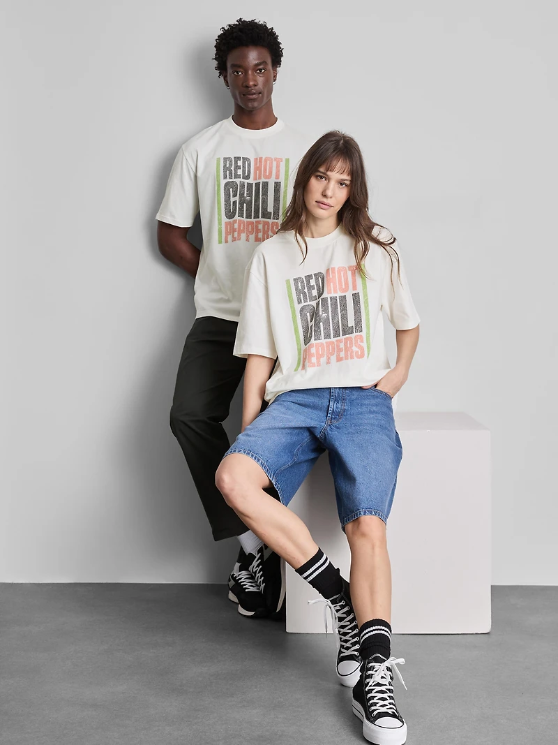 A short-sleeve tee with a round neckline, and Red Hot Chili Peppers design