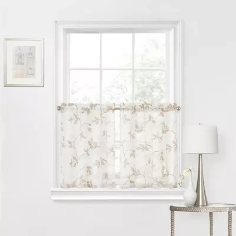 Meadow Embroidered Tier has foliage-designed embroidery on the sheer fabric. The foliage design offers a casual and charming style to any room.