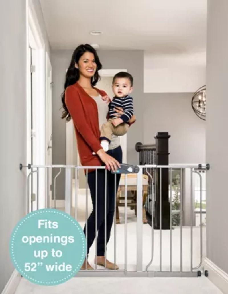 An essential tool for homes with young children and wide door or hallway openings, the Regalo Easy Step Extra Wide Platinum Baby Gate is a safe and convenient way to contain and protect both your child and home. Boasting an all-steel construction, with durability and strength in mind, this attractive safety gate is adjustable to accommodate a large range of door openings between 29”-52”. To make gate installation a breeze, pressure mount the gate with the included rubberized tension knobs or use the included hardware to attach the gate to your wall.