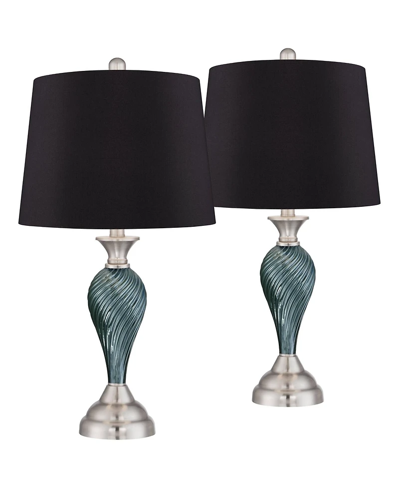 Ideal for a nightstand or end table, this lamp set includes two matching table lamps in a classic column shape with an eye-catching twist style. The greenish-blue color in the glass complements the cool tones in the brushed nickel finish accents. Each lamp is topped with a drum shade.