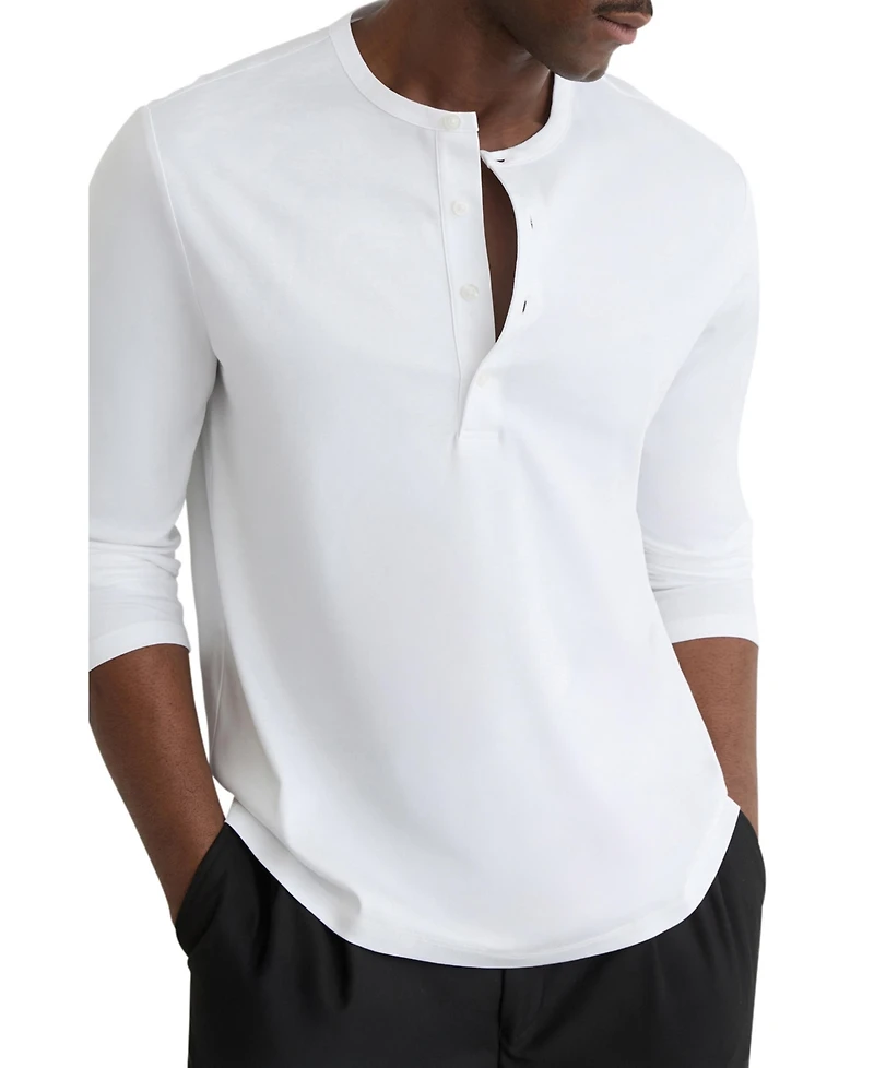The Cameron Henley is crafted from airwater cotton jersey, offering a smooth, breathable feel with a premium finish. It has a collarless round neckline and a half-button placket.
