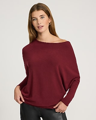 Created in a soft and stretchy knit fabric, this comfortable relaxed tee features long dolman sleeves and an off the shoulder neckline.