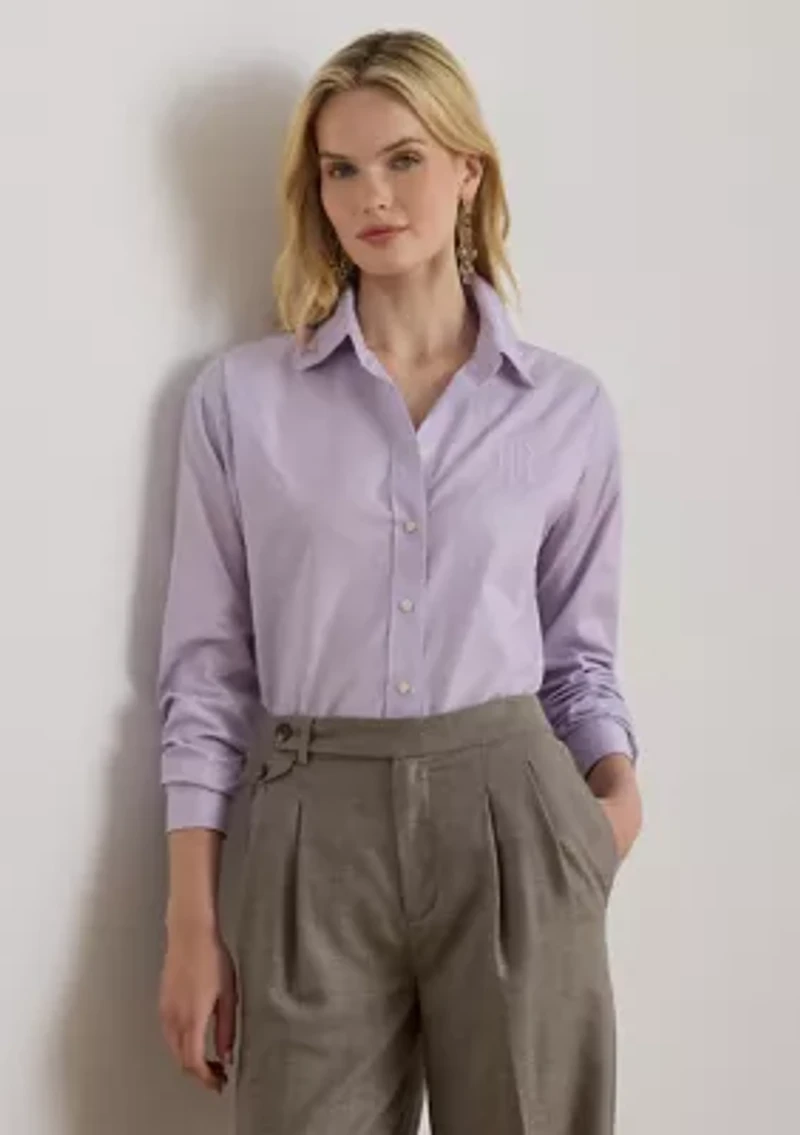 This timeless button-up shirt pairs a relaxed silhouette with lightweight, end-on-end woven cotton. Lauren’s tonal embroidered logo at the chest completes the look. Relaxed, easy fit. Intended to hit at the hip. Size medium has a 30" body length and a 32.5" sleeve length. Body length and sleeve length are taken from the center back of the neck. Sleeve length changes 0.75" between sizes. Point collar. Buttoned placket. Buttons custom-developed with a “Lauren Ralph Lauren” logo. Long sleeves with buttoned barrel cuffs. Dropped shoulders. Tonal “LRL”-embroidered logo at the left chest. Back yoke. Shirttail hem. 100% cotton. Machine washable or dry clean. Imported. By choosing our cotton products, you’re supporting our investment in the Better Cotton™ mission to help cotton communities survive and thrive, while protecting and restoring the environment. This product is sourced via a system of mass balance and therefore may not contain Better Cotton™. Visit bettercotton.org/mass balance for more information about mass balance. Model is 5'10" (178 cm) and wears a size small.