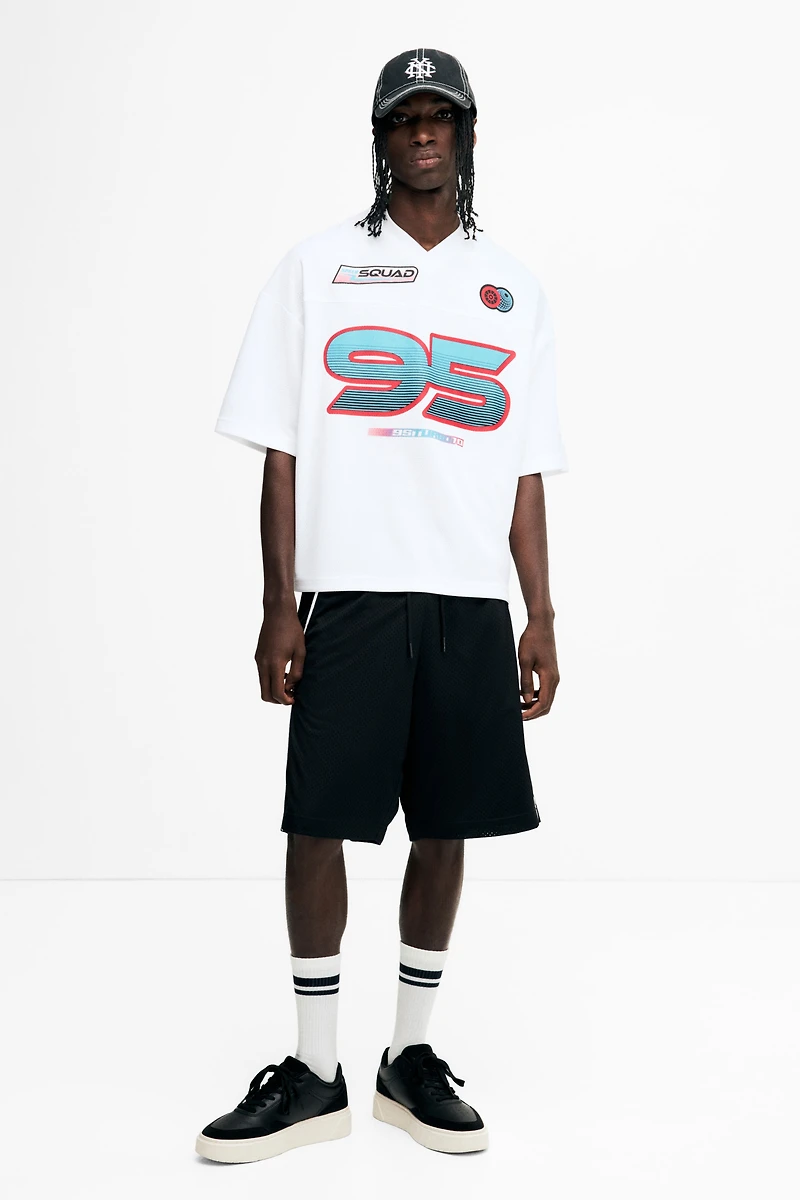 Relaxed-fit, knee-length shorts in mesh with contrasting piping and a casual but not oversized silhouette. Elasticized, drawstring waistband and discreet side pockets.