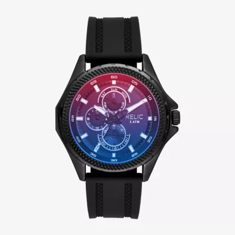 Fun and functional, the Relic men's Julian multifunction watch in black touts a soft black silicone strap and iridescent laser crystal lens.