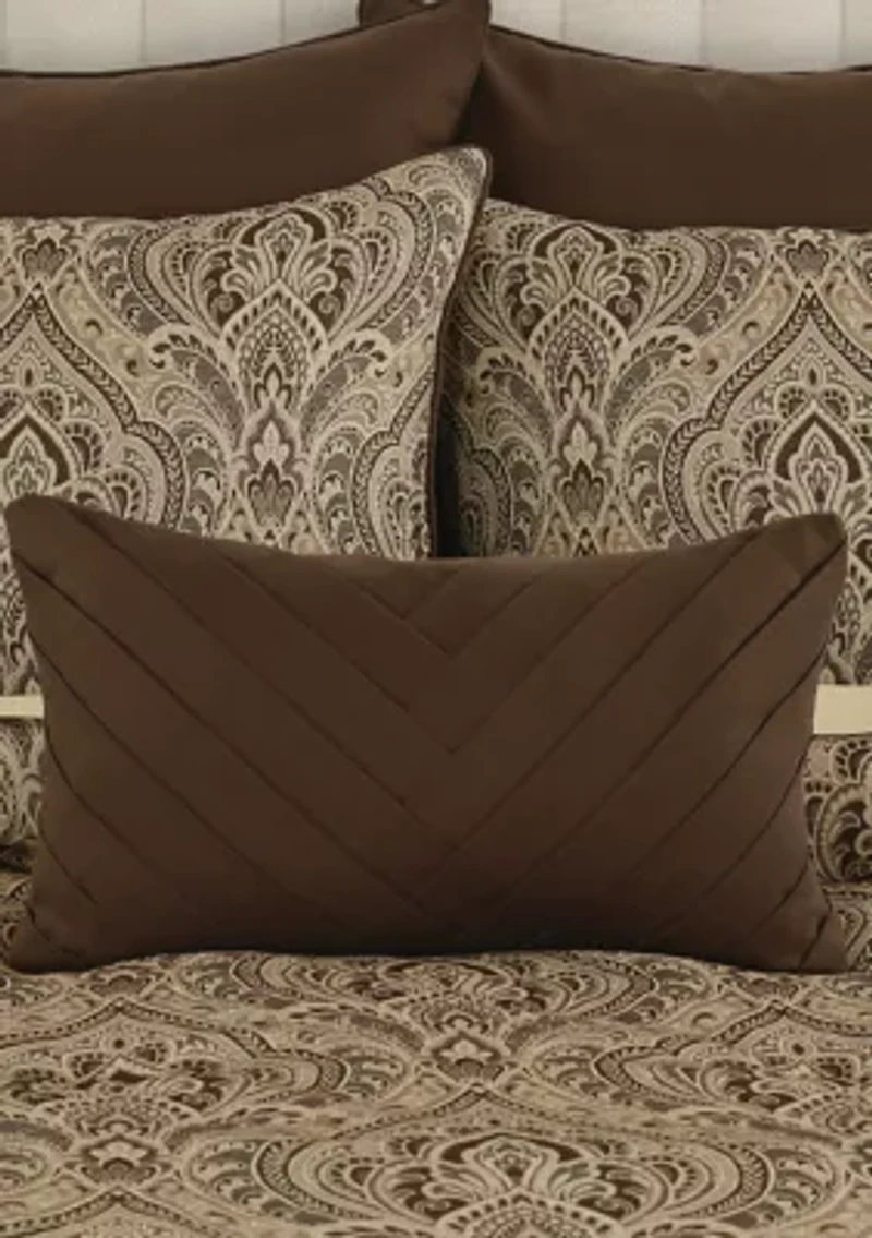 This Royal Court Remy boudoir pillow is intricately designed with a hand-pleated chocolate-colored fabric. The boudoir pillow reverses to a coordinating solid chocolate fabric and coordinates beautifully with the Remy comforter set and window collection. Medium firmness Imported Product Specifications 12" x 20" Material & Care Polyester fill Polyester Dry clean only