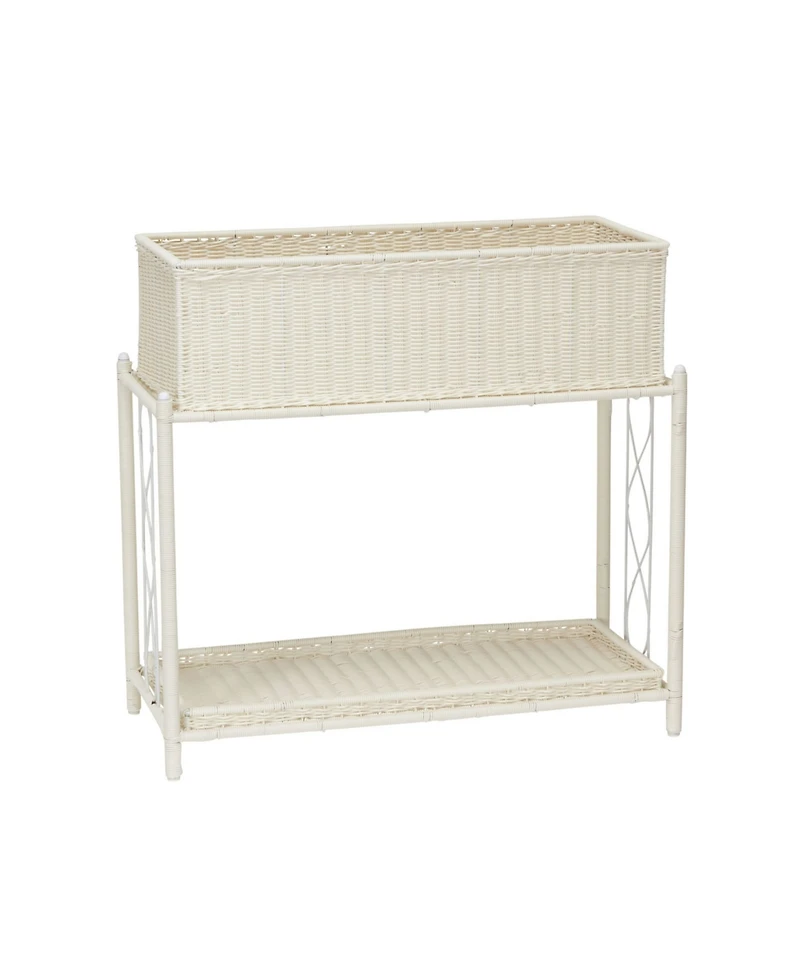 Show off your plant collection with this stylish two tier plant stand. The stand is composed of a study wire frame and includes two shelf components, a planter box and a tray, that can be used interchangeably on either level. Use both shelves on the wire stand, or separate them, using the planter box or tray on its own on a porch or in a window. The shelves are made of white plastic resin that has been woven to give the baskets a woven-like appearance without the limited durability of woven or the maintenance it requires. Use this plant stand to display real or artificial plants (or a mixture of both).