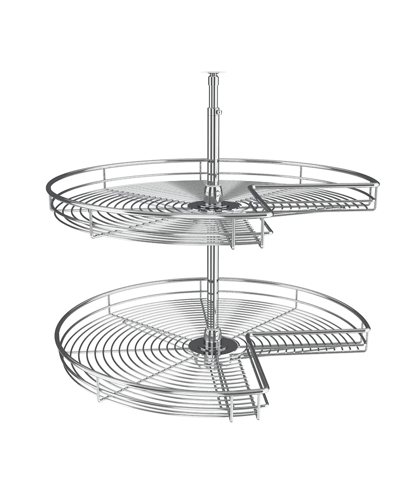 Whether you are replacing an old unit or just adding extra storage to your corner cabinet, you will not be disappointed with the Rev-a-Shelf Chrome Kidney-Shaped 2-Shelf Lazy Susan. With a high-quality design and durable rotating hardware that makes installation simple, this lazy susan will help you organize your kitchen cabinets in a breeze. Designed for corner base cabinets, this Lazy Susan's telescoping shaft can be adjusted to fit cabinets with a 26'' to 31'' inch inner height. The organizer includes hardware that allows the unit to rotate smoothly and independently. Once installed, you can adjust the shelves to fit whatever you need. The strong wire construction holds up to 64 lb. per square foot and is easy to wipe clean. Double check your cabinet's opening (inside dimensions) to allow the best fit. Measure side to side (width), front to back (depth or length), and top to bottom (height).