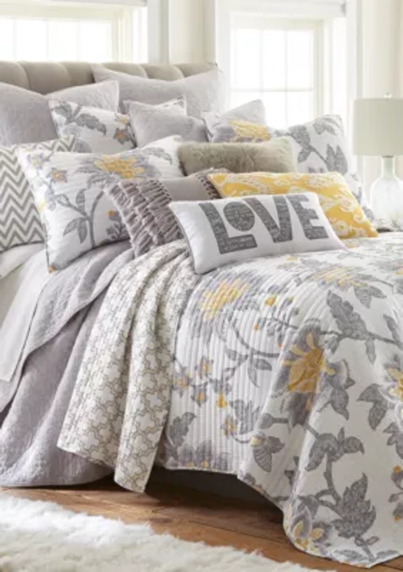 Soft grays with yellow accent detailed flowers make the Levtex Home Reverie Collection a beautiful bedroom addition. It features a matching lattice back pattern and is made from 100% pre-washed cotton. Twin Set: 68 in x 86 in quilt 20 in x 26 in standard sham (1) Full/Queen Set: 88 in x 92 in reversible quilt 20 in x 26 in standard shams (2) King Set: 106 in x 92 in reversible quilt 20 in x 36 in king shams (2) Floral pattern Imported Material & Care Cotton Machine washable