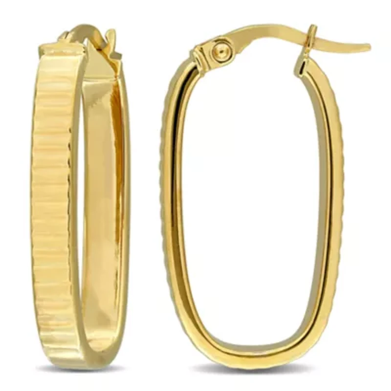 Make a modern statement with these ribbed rounded rectangle hoop earrings in 10K yellow gold, featuring a textured design that adds dimension and catches the light beautifully. The hinge snap closures provide secure, comfortable wear, while the unique rounded rectangle shape offers a contemporary twist on classic hoops. Perfect for everyday elegance or layering with other earrings, these hoops combine polished sophistication with bold, fashion-forward style. 2 Click top closure, Jewelry clasp Polished finish Warranty available, 60 days Italy Imported Material & Care 10K Yellow Gold Metal, Yellow Gold Clean with a soft cloth.
