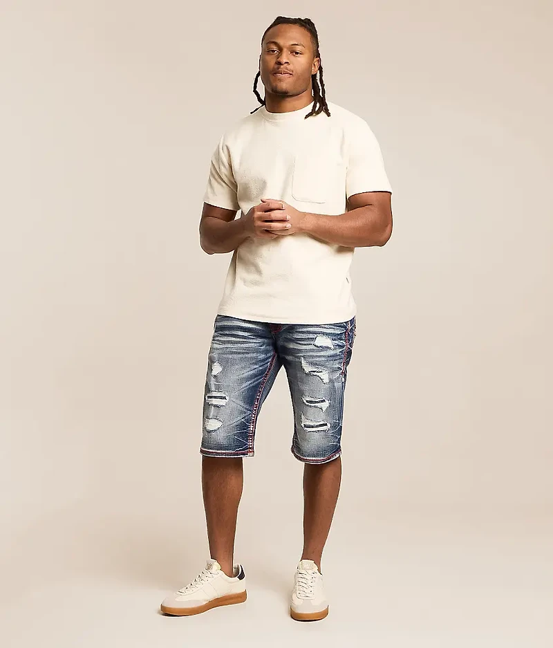 Slim fit short Comfort stretch fabric Mid-rise 14" inseam Color pop stitch faux flap back pockets Destruction and denim backing details Zip fly