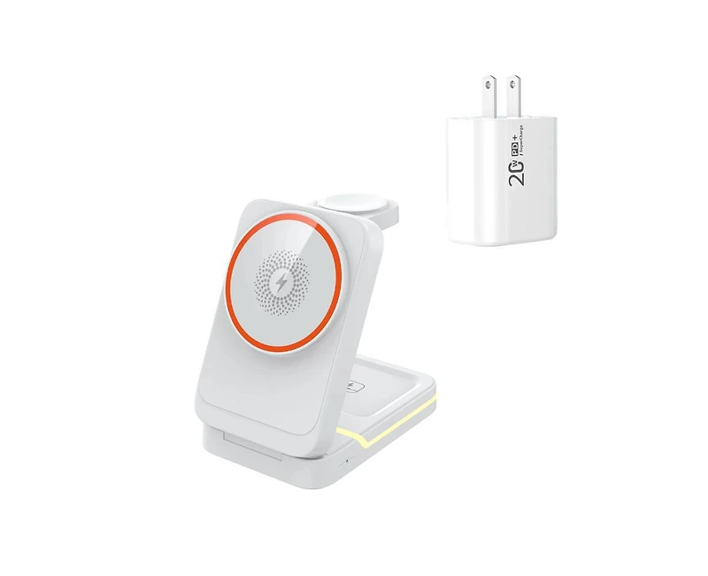 Please note that this product includes a phone stand, data cable, and charging port (charging adapter)! The 3-in-1 Magnetic Wireless Charger is equipped with advanced technology that enables fast charging for your phone, ensuring that you can quickly get back to your busy schedule without any delays. The charger also features a smart chip that optimizes the charging process for your earphones and watch, providing a safe and efficient charging experience for all your devices. The charger's compact and foldable design makes it perfect for travel, allowing you to easily pack it up and take it with you wherever you go.The charger's sleek and minimalist design fits seamlessly into any home or office environment, providing a clutter-free charging solution that keeps your space organized and stylish. Its multi-device charging capability is ideal for those who own multiple gadgets and are looking for a convenient way to keep them all charged and ready to use.